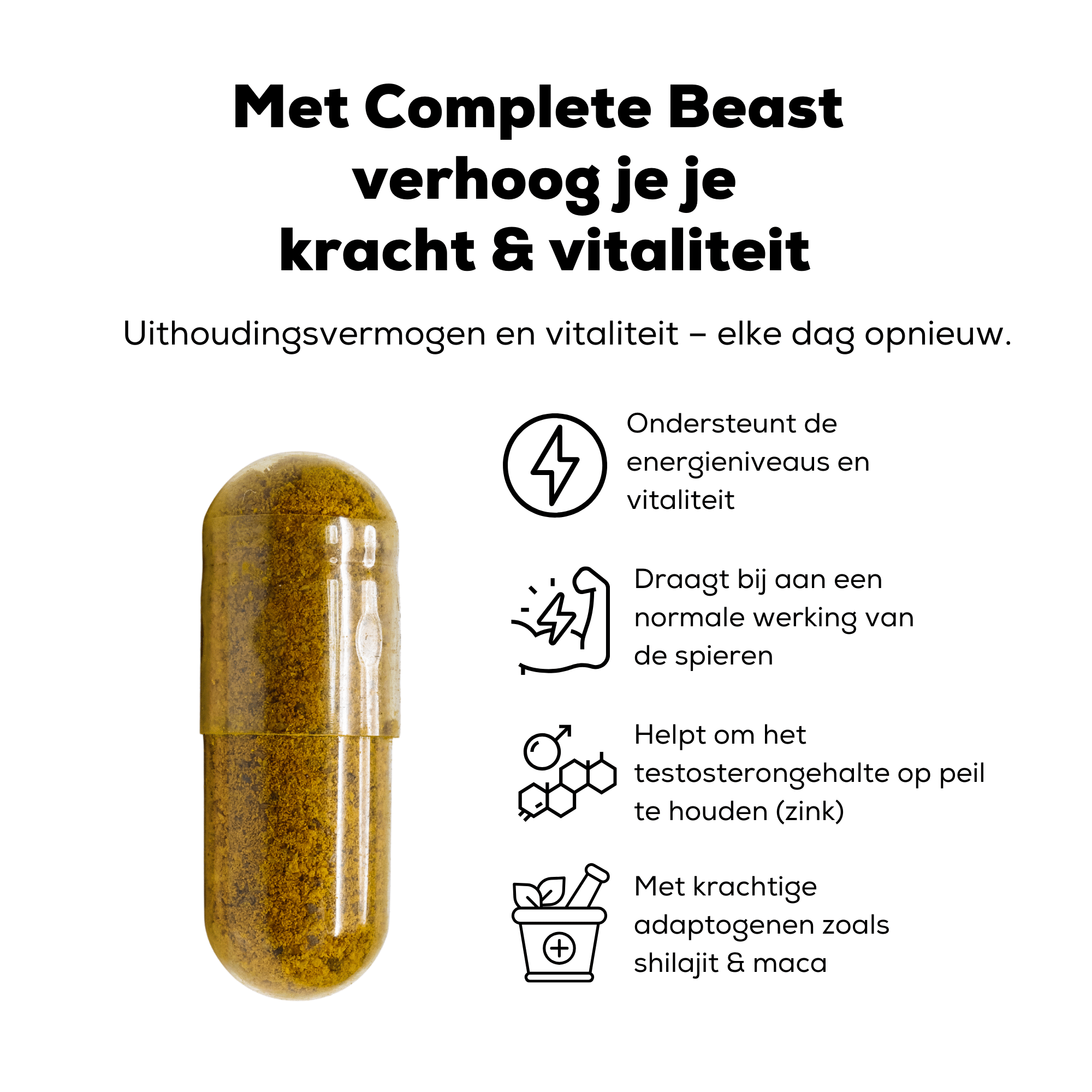 Belangrijk: Complete Beast ondersteunt je lichaam om zijn eigen testosteron te produceren en te behouden. Het zijn geen hormooninjecties. De resultaten zijn natuurlijk en duurzaam.