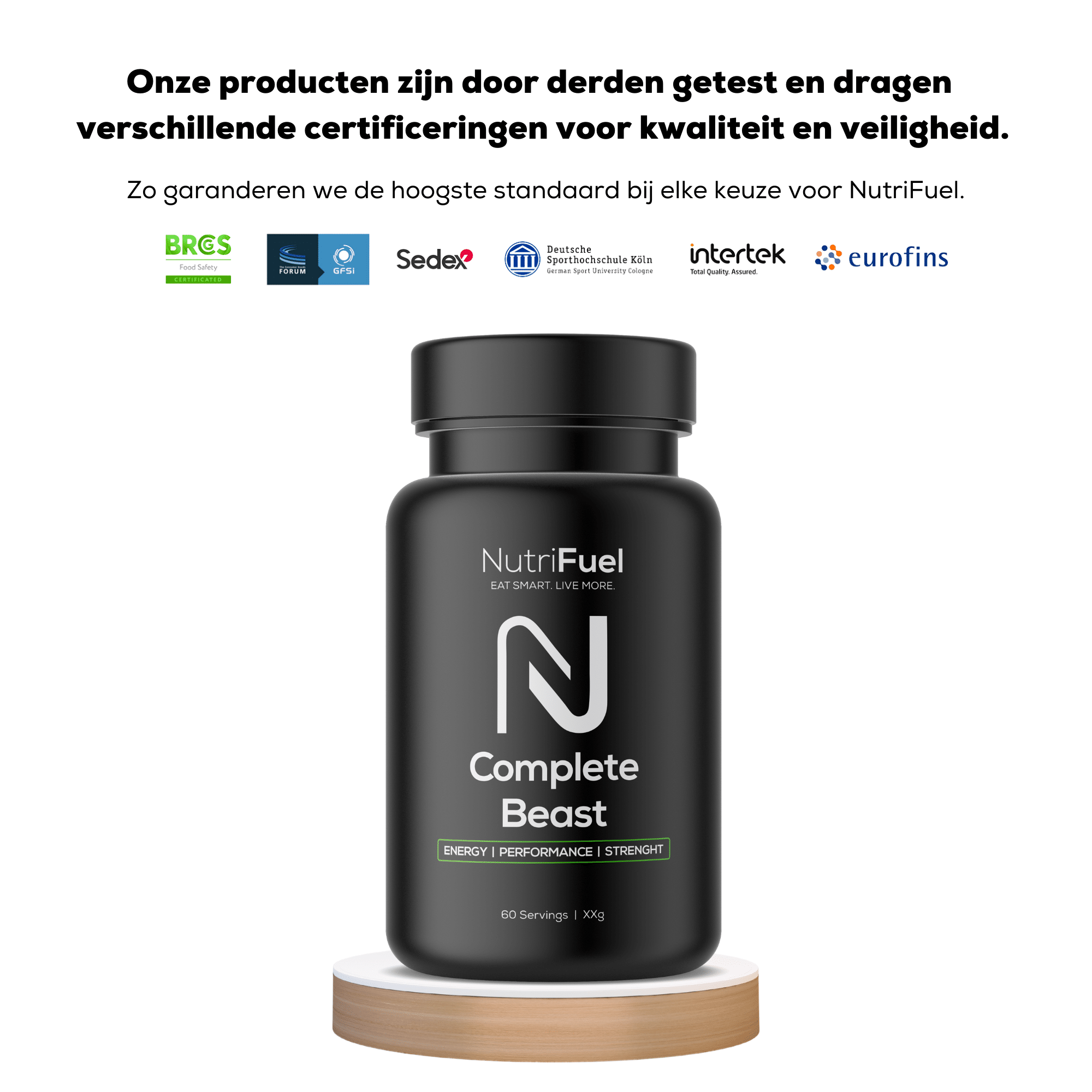 De reden hiervoor is eenvoudig: Nutrifuel Complete Beast gebruikt uitsluitend grondstoffen van de hoogst mogelijke kwaliteit, in klinisch relevante doseringen en met zorgvuldig geselecteerde extracten.