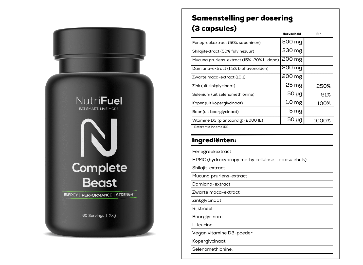 Nutrifuel Complete Beast bevat uitsluitend ingrediënten in doseringen die in studies daadwerkelijk effect laten zien — geen marketinghoeveelheden die niets doen in je lichaam.