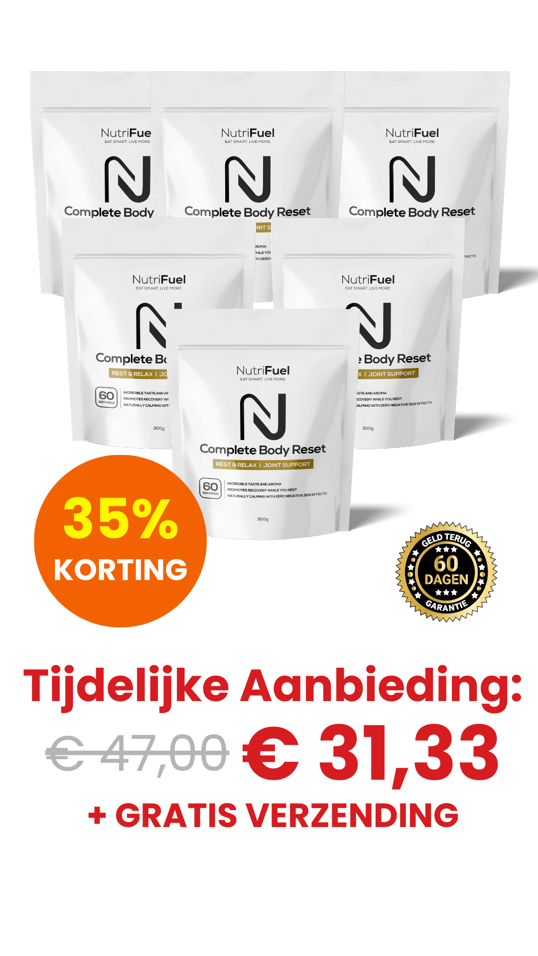 Daarom bieden we met onze exclusieve Inflatie Promotie korting Nutrifuel Complete Body Reset aan vanaf slechts €31,33/zak. Het beste van alles is dat er geen risico is, want onze 60-dagen geld-terug-garantie neemt alle risico's weg.