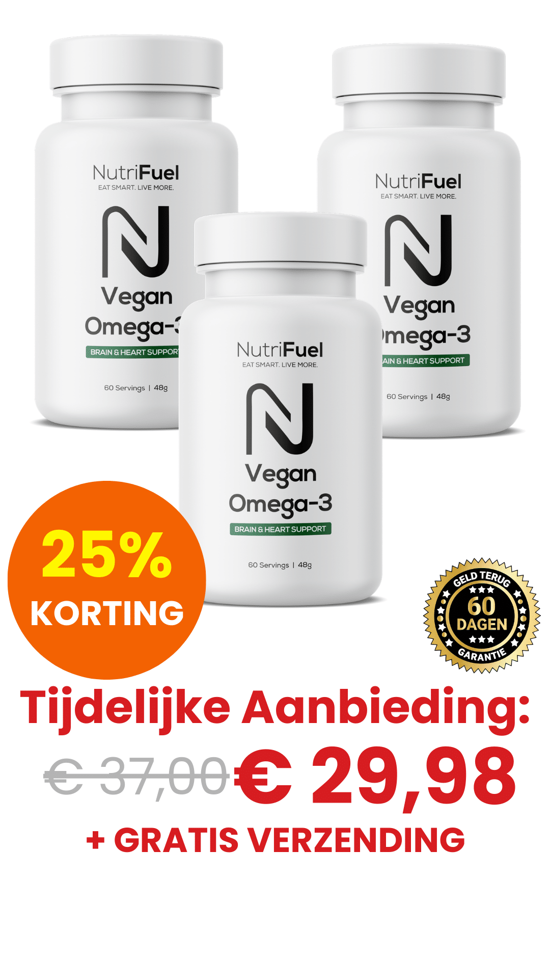 Je korting is al toegepast! Voor zeer beperkte tijd kun je Nutrifuel Vegan Omega-3 bestellen met een introductie korting van -35% zolang de voorraad strekt, en GRATIS verzending!